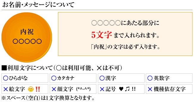 ※同じ内容(メッセージ・絵柄等)での5個入りになります。 ※文字や絵柄は食用の着色料ですので、そのまま食べられます。 ※こちらの商品は会津若松市の製造工房より出荷いたします。 ※外箱・包装のデザインが変更になる場合もございます。 ※化粧箱入りでお届けいたします。ギフト仕様の状態でお届けいたしますので、追加の包装・ラッピングご要望はご容赦下さい。 |