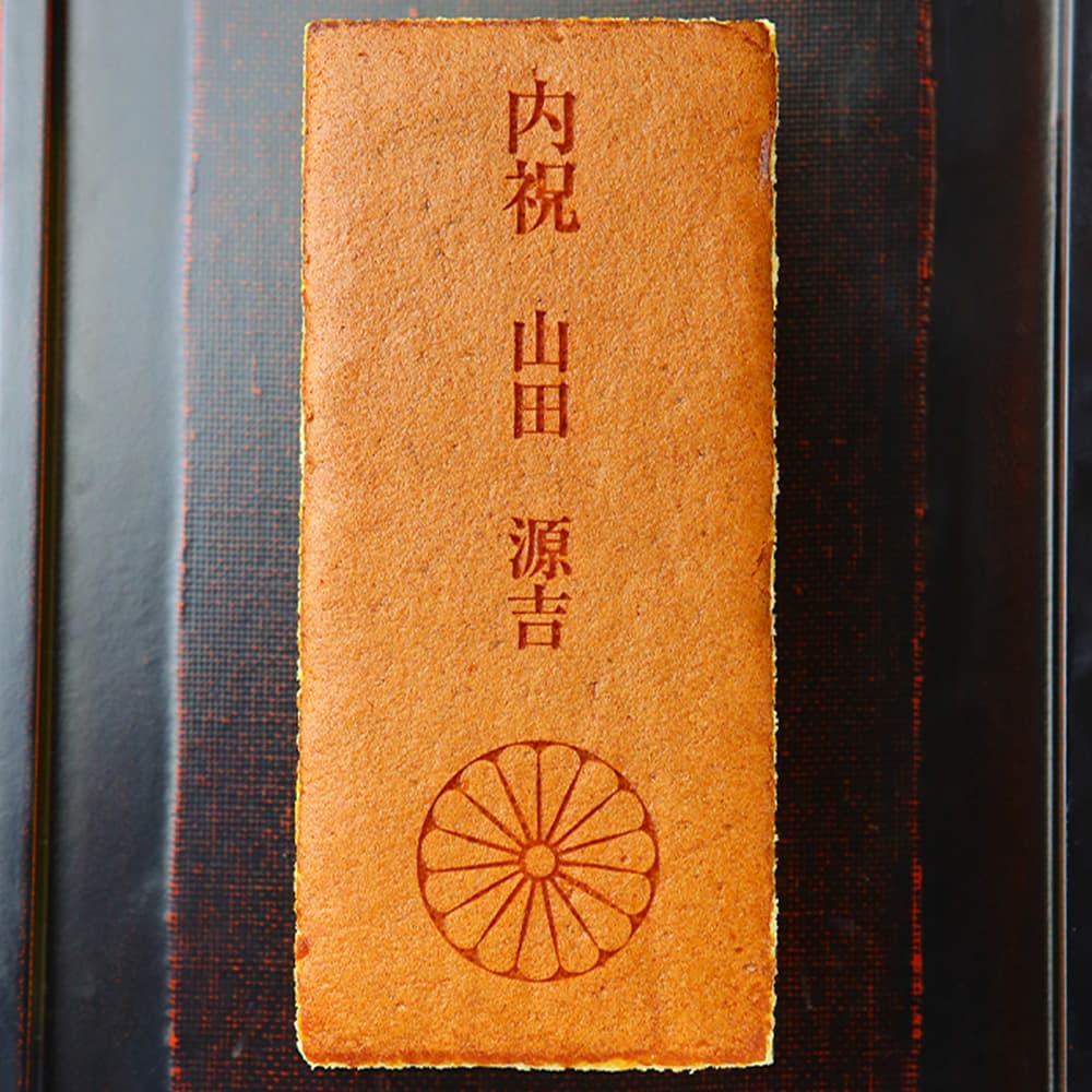 叙勲のお祝いや褒章、表彰の贈り物に。「内祝」の文字とご紋が入ったカステラに、お名前をお入れしてお届けします。