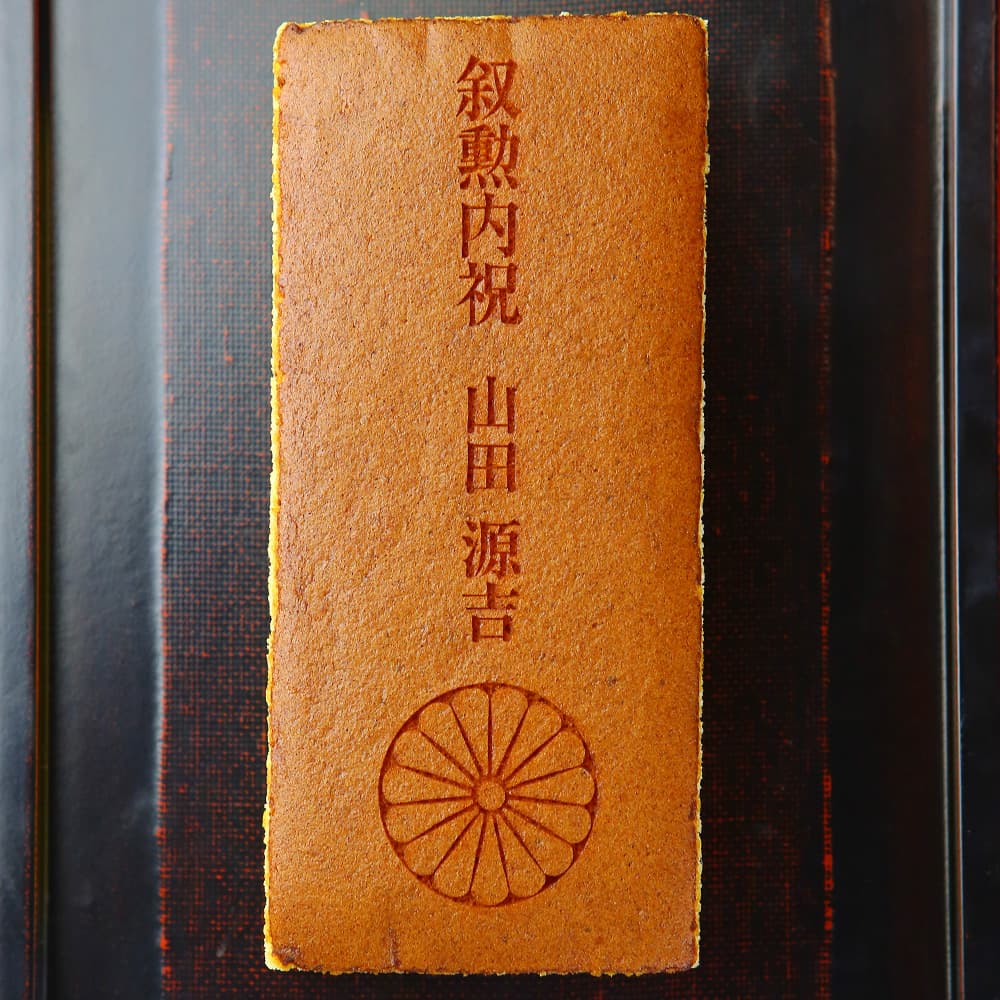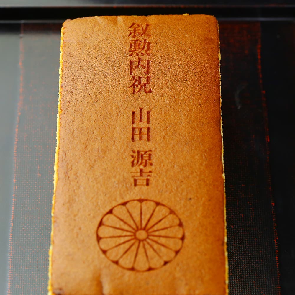 叙勲のお祝いや褒章、表彰の贈り物に。「叙勲内祝」の文字とご紋が入ったカステラに、お名前をお入れしてお届けします。
