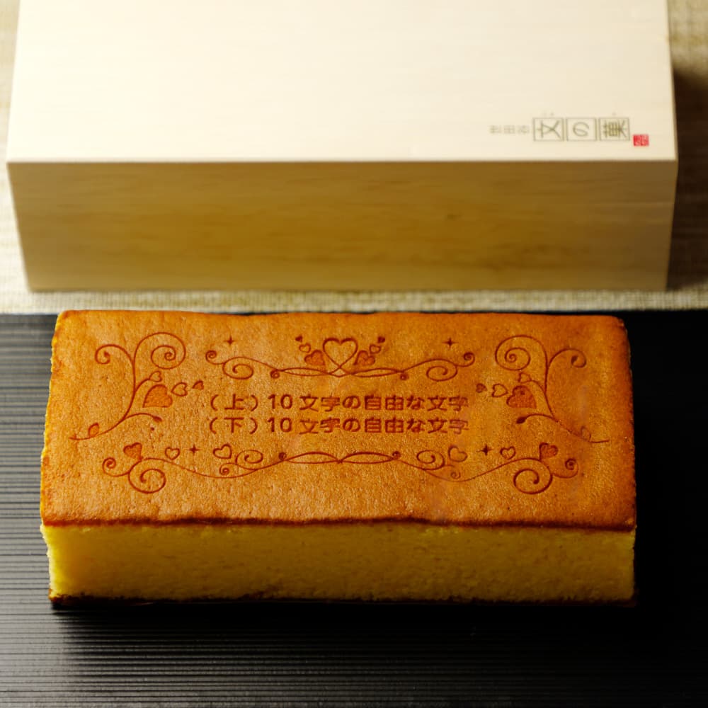 ハート模様のデザイン入り オリジナルメッセージカステラ (木箱入り)
