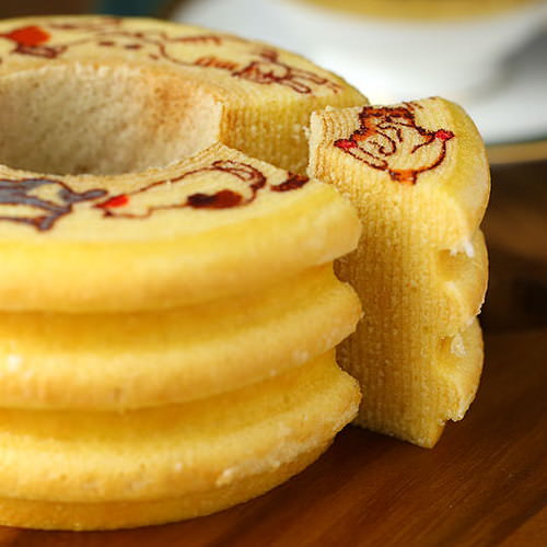 | 原材料名 | 鶏卵、砂糖、ショートニング、小麦粉、クリーム(乳製品)、マーガリン、コーンスターチ、米粉、洋酒、水飴、植物油、食塩、トレハロース、乳化剤、ソルビット、膨張剤、香料、酒精、リン酸塩(Na)、酸化防止剤(VE)、着色料(カロチン、青1、黄4、赤102、赤106) ※着色料は、バウムクーヘンの文字等の印刷に使う食用インクです。 |
