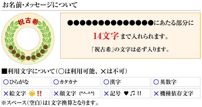 | 備 考 | ※文字や絵柄は食用の着色料ですので、そのまま食べられます。 ※こちらの商品は会津若松市の製造工房より出荷いたします。 ※外箱・包装のデザインが変更になる場合もございます。 ※化粧箱入りでお届けいたします。ギフト仕様の状態でお届けいたしますので、追加の包装・ラッピングご要望はご容赦下さい。 |