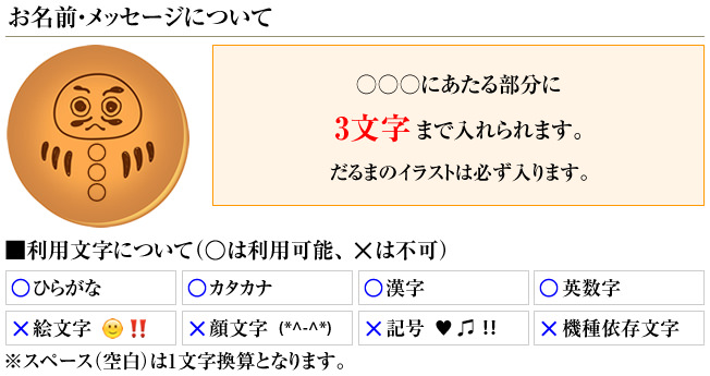 愛嬌たっぷりの達磨(だるま)のイラストに、お名前や文字をお入れしたおめでたいどら焼きをお作りいたします。