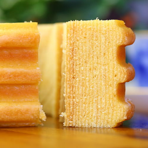 毎朝仕入れる新鮮な卵を丁寧に1つずつ、確認しながら職人が手で割っています。卵黄でできた生地と卵白でできたメレンゲを最後に合わせる「別立て」という製法によって、食べ応えがありながらしっとりとした食感に仕上がっています。