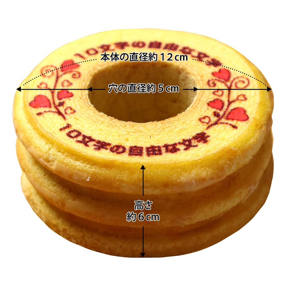 お祝い・内祝・お礼・お誕生日、気持ちを伝えたい贈り物に、お名前やオリジナルメッセージが入れられるバウムクーヘンです。メッセージの周りをかわいいハート模様のイラストで飾りました。